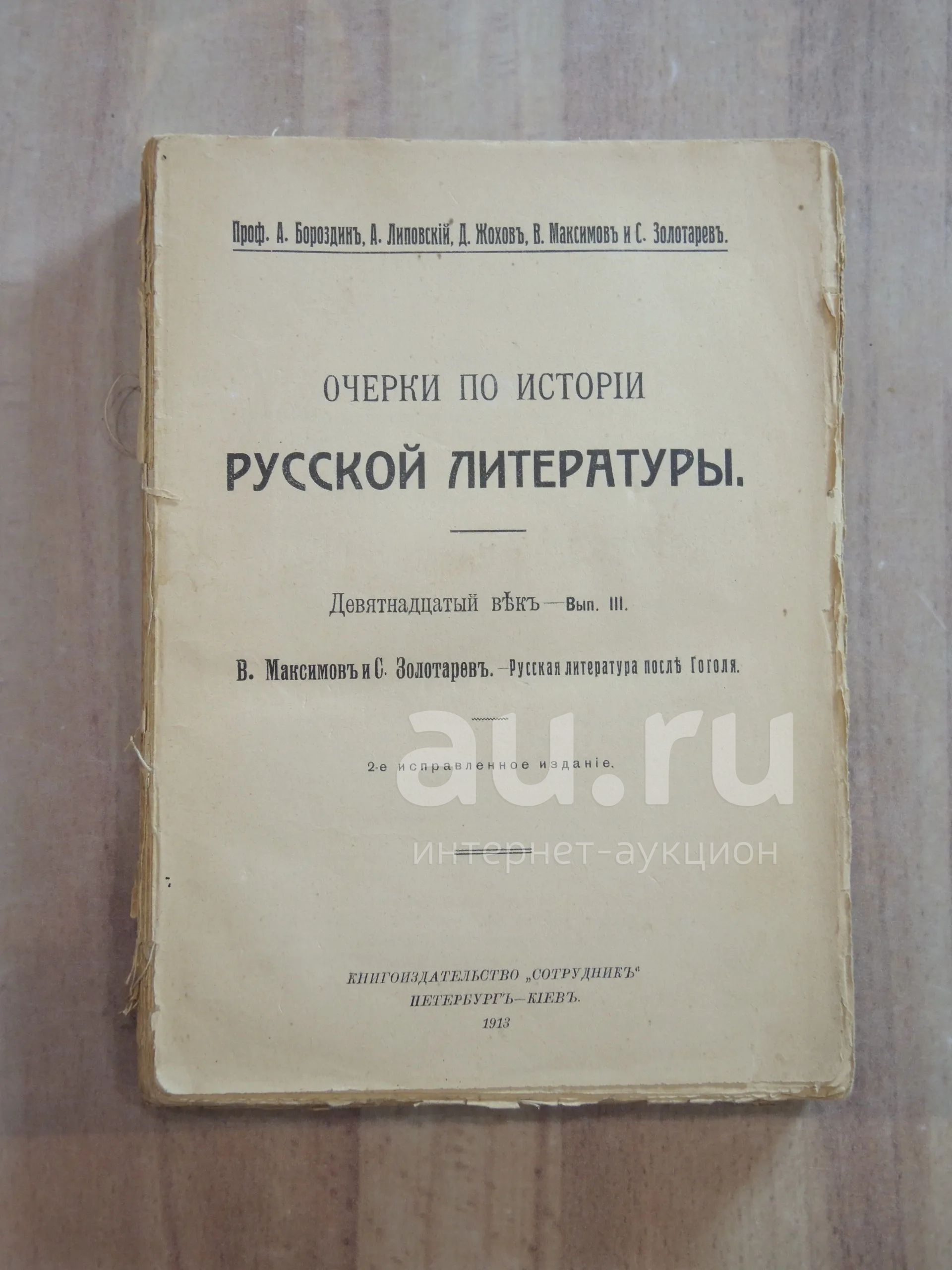 А.Бороздин, А. Липовский, Д. Жохов ,В. Максимов, С. Золотарев "Очерки по истории русской литературы" Девятнадцатый век, Выпуск III, книгоиздательство "Сотрудникъ", Петербург / Киев, 1913 г., рамер: 16,5*22,5 см., 400 стр. (все пронумерованные листы присуствуют)Состояние на фото (Отсутствует обложка, блок расходится на множество частей, имеются непрорезанные листы)