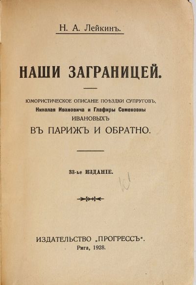 Н.А.Лейкин. Наши заграницей. Юмористическое описание поездки супругов, Николая Ивановича и Глафиры Семеновны Ивановых в Париж и обратно. * 1928 год издания. * редкое эмигрантское издание в Риге.*